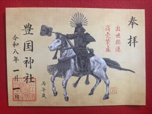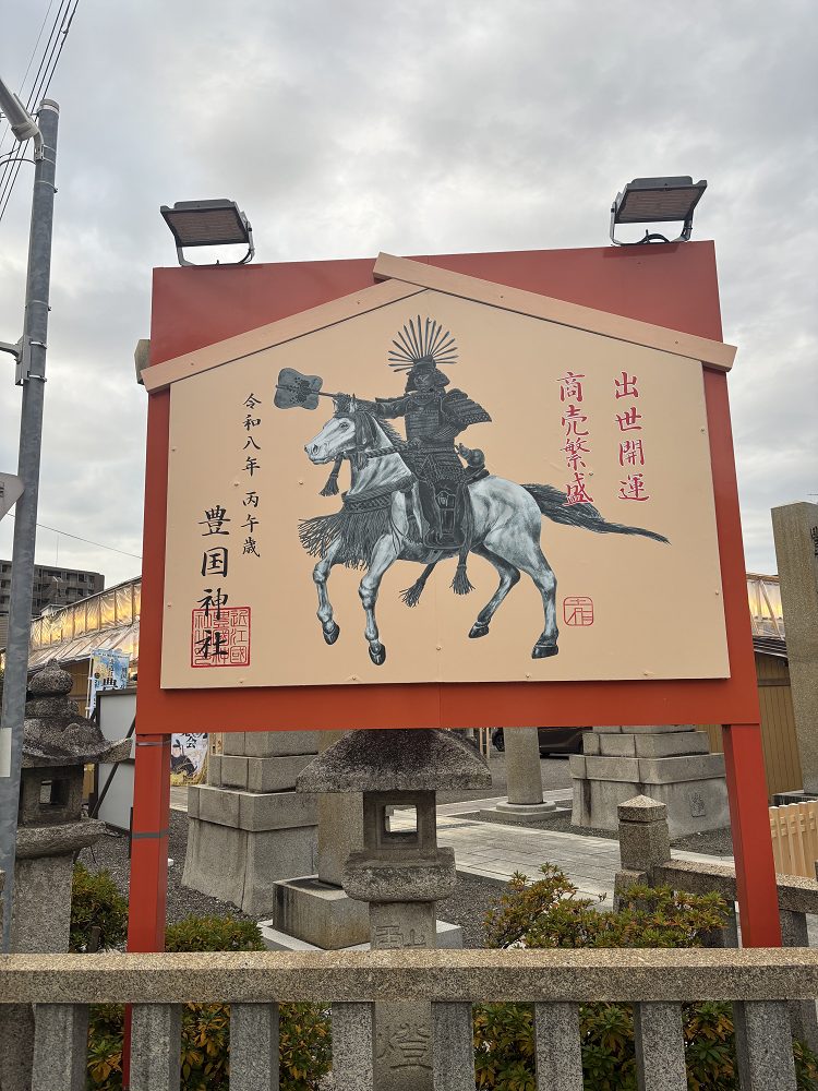 新年を迎えるにあたり、豊臣秀吉公が白馬に跨り勇壮に駆ける「大絵馬」を奉掲いたしました。今回も動物墨絵師「佐藤周作」様にお願いしました。